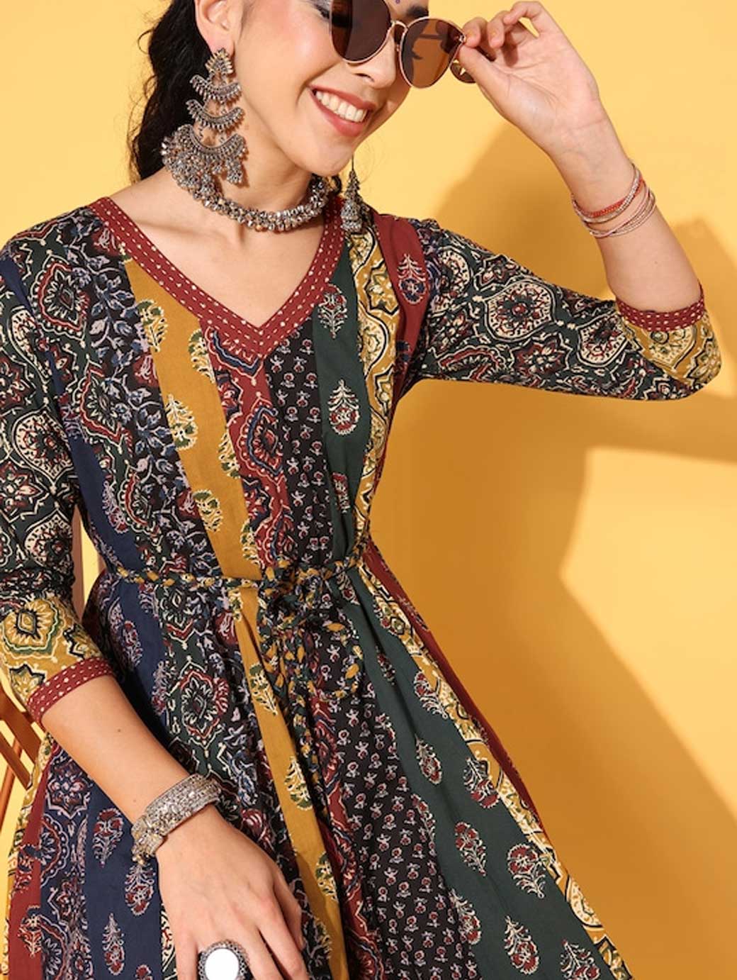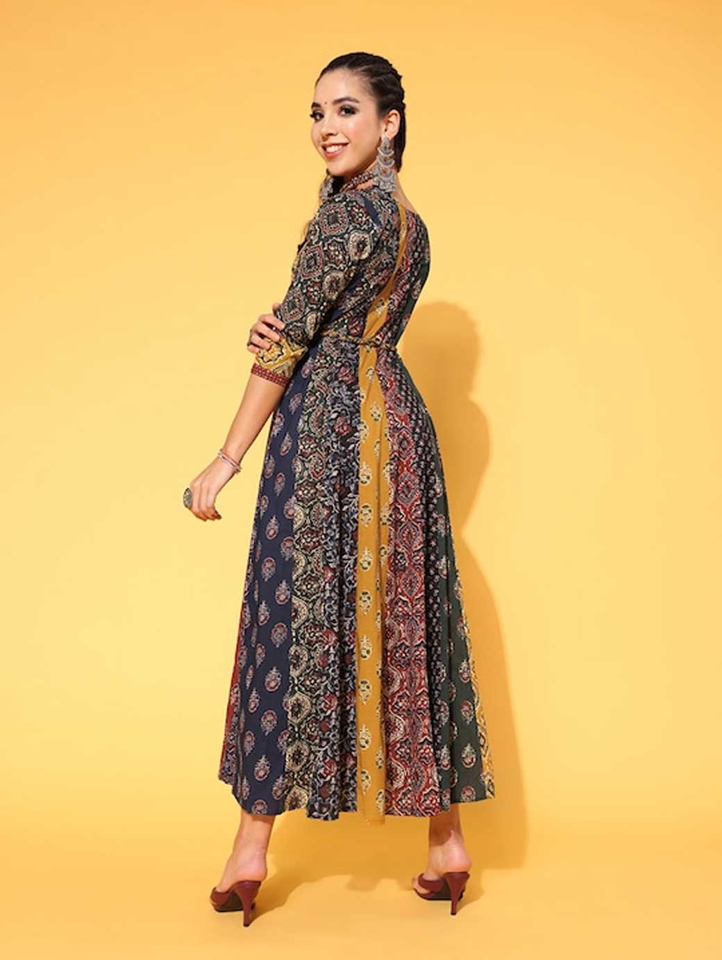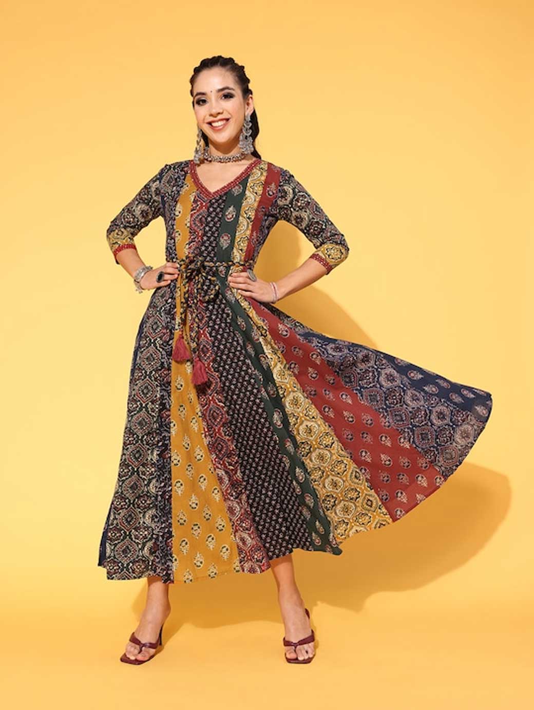 Upgrade your wardrobe by opting for this classy dress. This dress features an attractive floral print and V-neck for enhanced appeal. Red shade Beautiful floral print V-neck Three-quarter regular sleeves Cotton, hand wash Trend Alert With gathered volumes, tiers, pleats, bias drapes, and swaying silhouettes, the swirling volumes trend is a mix of whimsical and playful femininity. It plays with beautiful prints and patterns, such as floral, pastel colour-blocking, embroidered, Nu Noheme, floral all-over print, ombre, rich gold foil print, porcelain blooms..