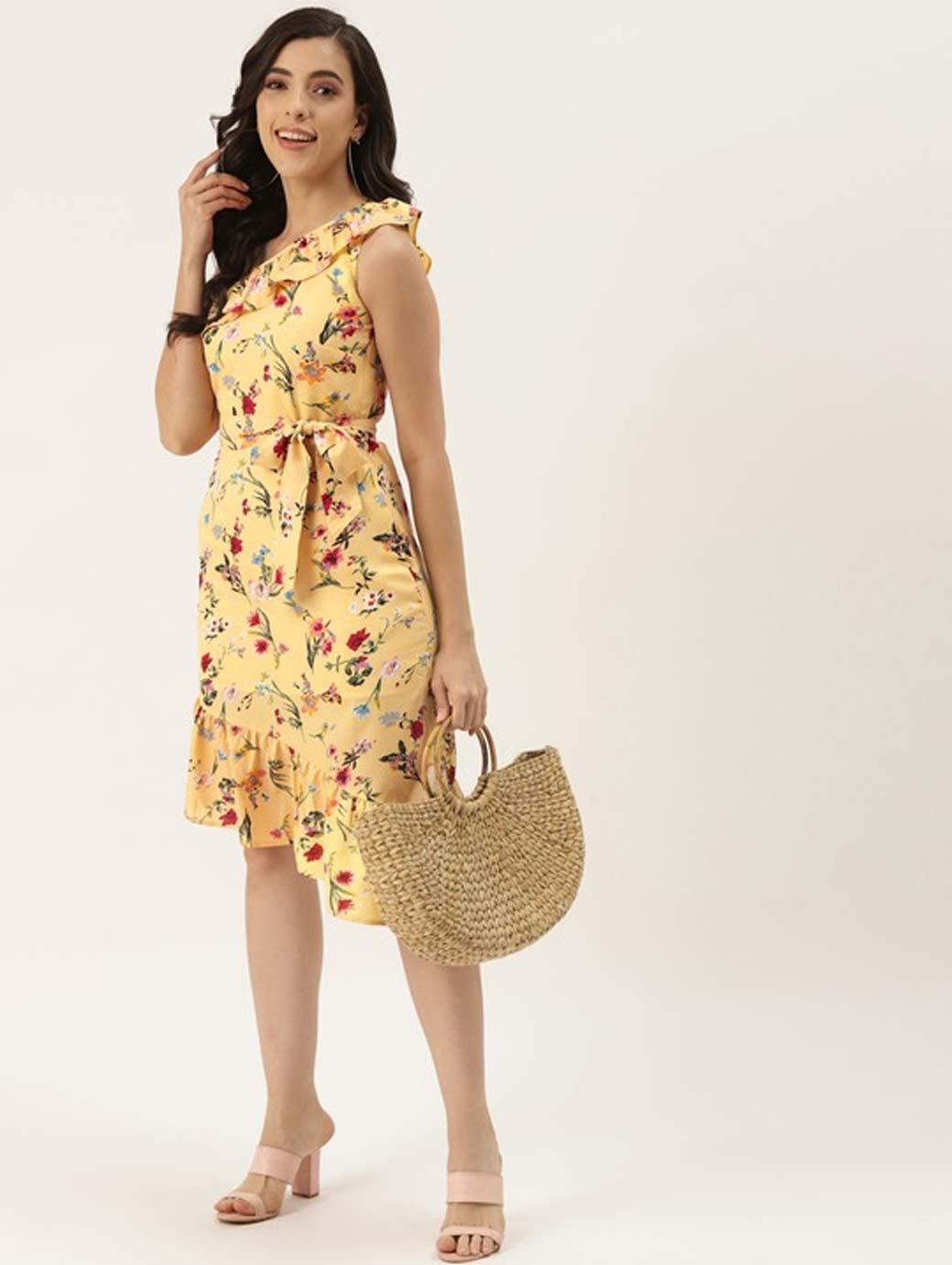 Beige and red floral print a-line dress, One shoulder, Sleeveless, no sleeves, Ruffled detail, Knee length in flounce hem, Concealed zip closure, Comes with a belt.