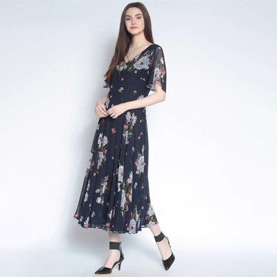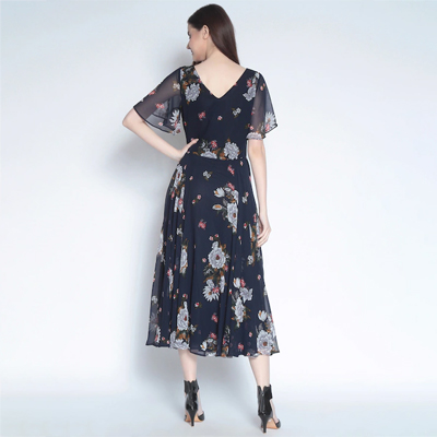 women maxi dress, has a V-neck, short sleeves, flared hem