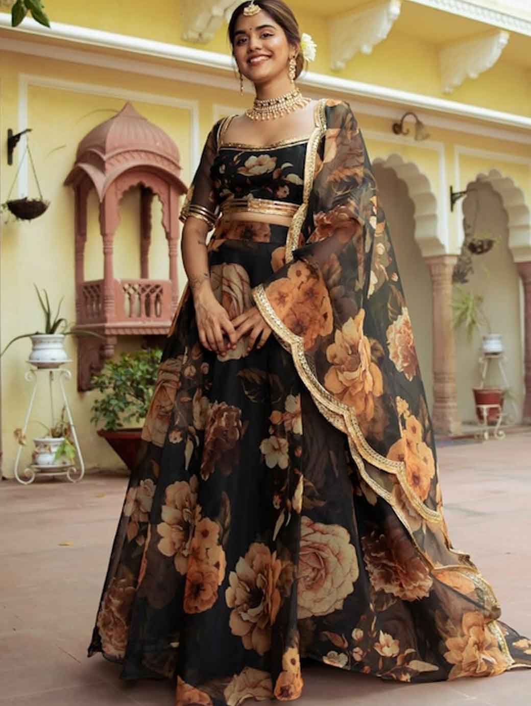 Green and brown printed ready to wear blouse, has a round neck, short sleeves, green and brown printed ready to wear lehenga, has zip closure, flared hem