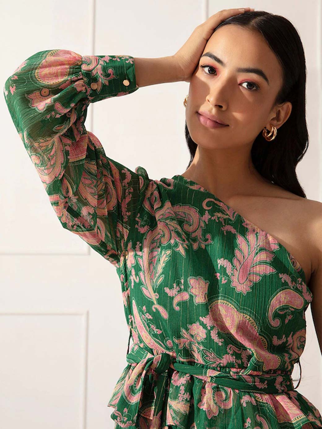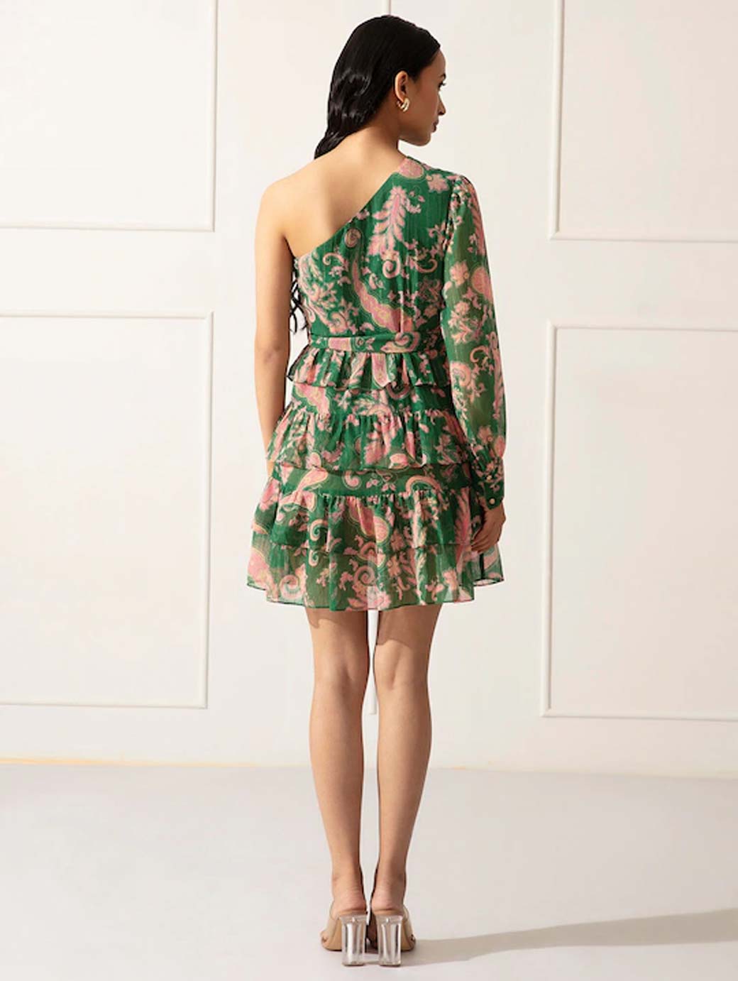 Green and pink floral print fit & flare dress One shoulder Long, regular sleeves Above knee length in flounce hem Chiffon fabric Concealed zip closure