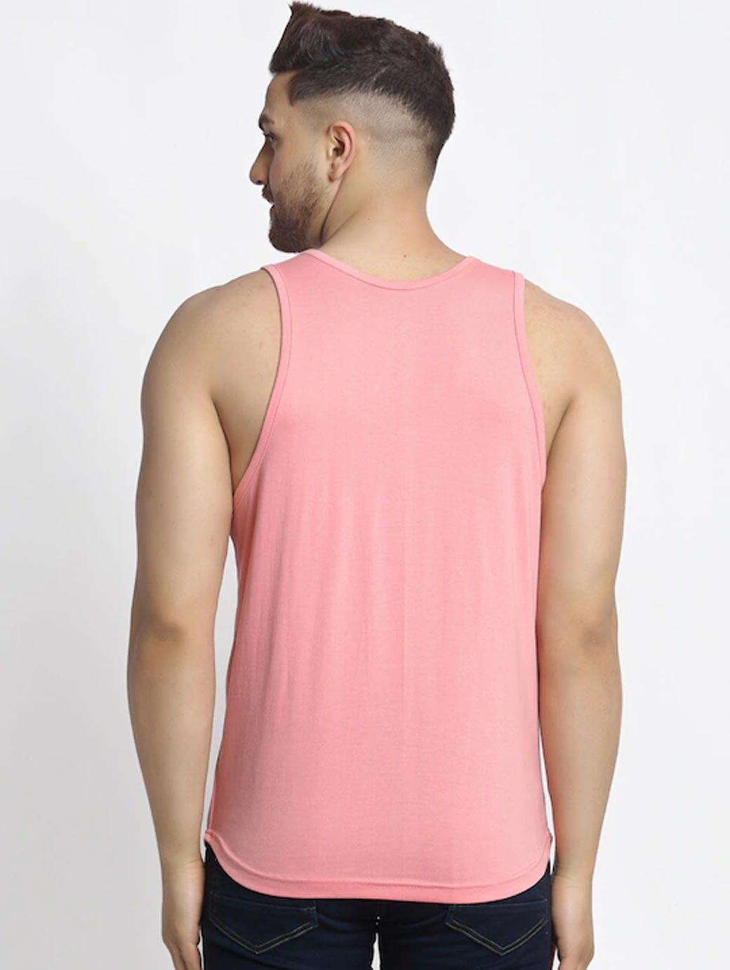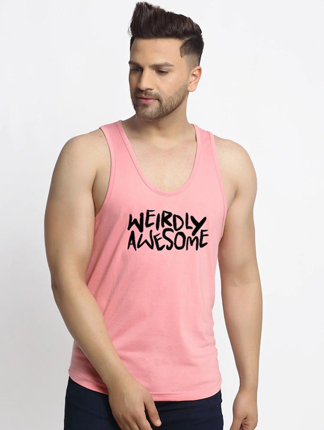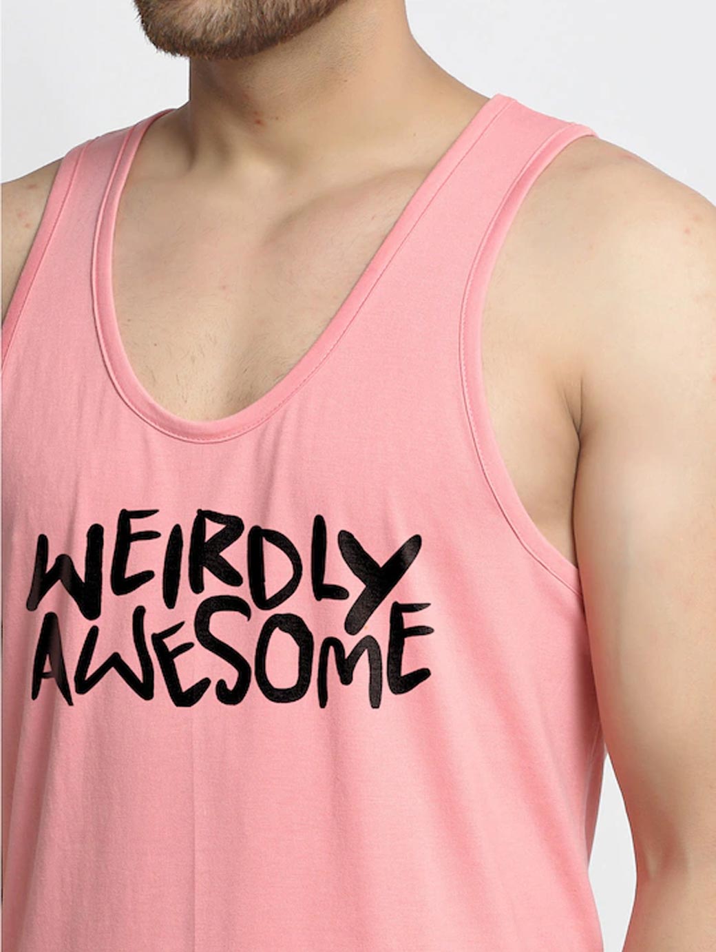Coral pink printed innerwear gym vest, has a scoop neck, sleeveless