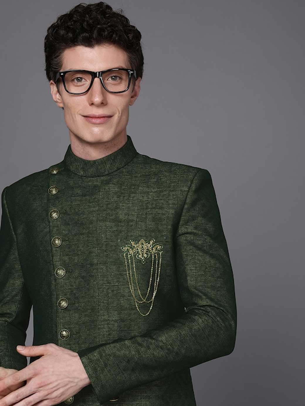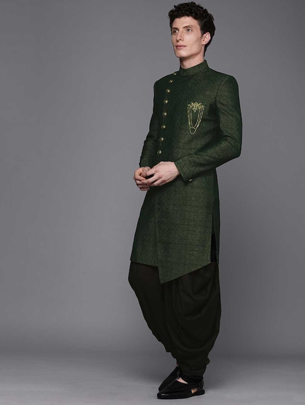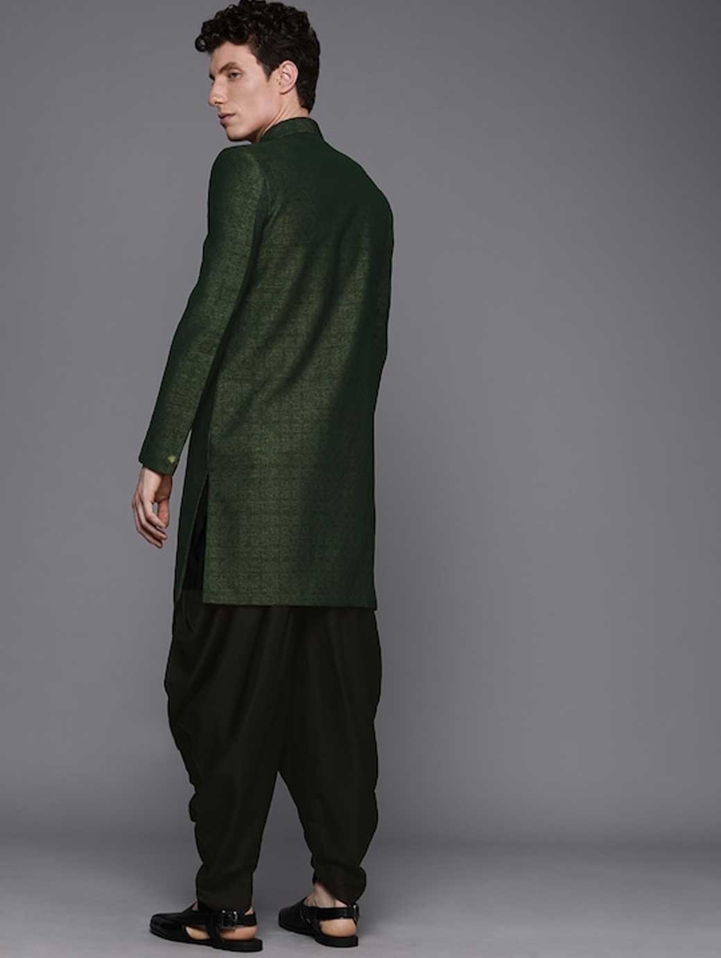 Green & Black Printed Sherwani and Churidar Green solid Sherwani, has mandarin collar, long sleeves Beige solid churidar, has drawstring closure