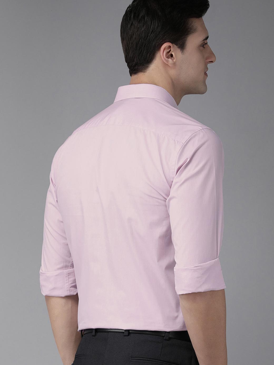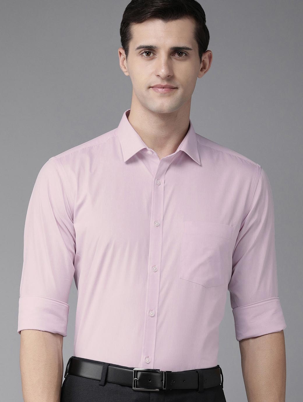 Lavender solid opaque Formal shirt ,has a cutaway collar, button placket, 1 patch pocket, long regular sleeves, curved hem