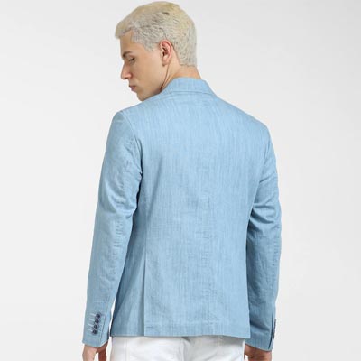 Solid slim-fit formal blazer has a peaked lapel collar, single-breasted with a double-button closure, long sleeves, two pockets and one welt pocket