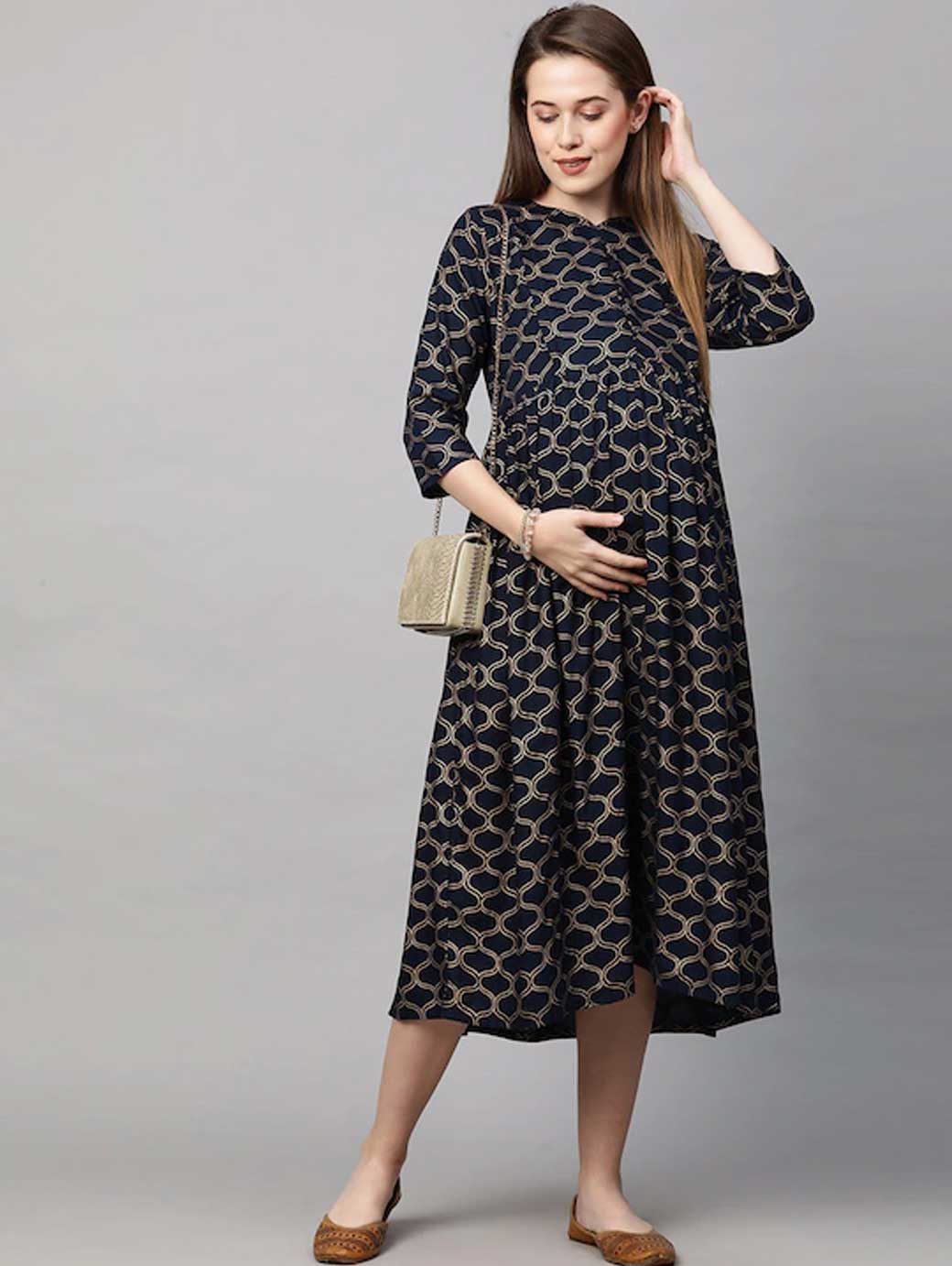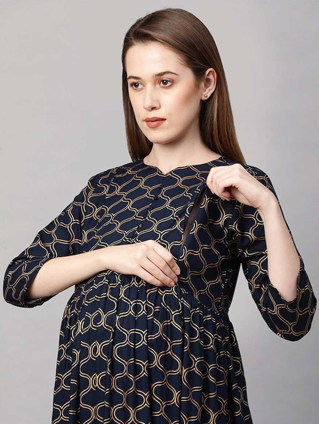 Navy Blue & Gold-Toned Geometric Printed Maternity Nursing A-Line Midi Dress