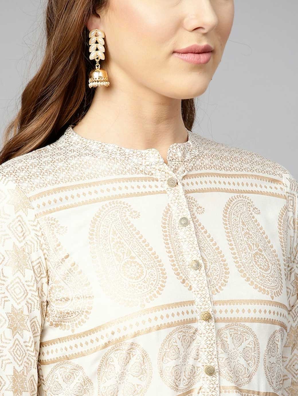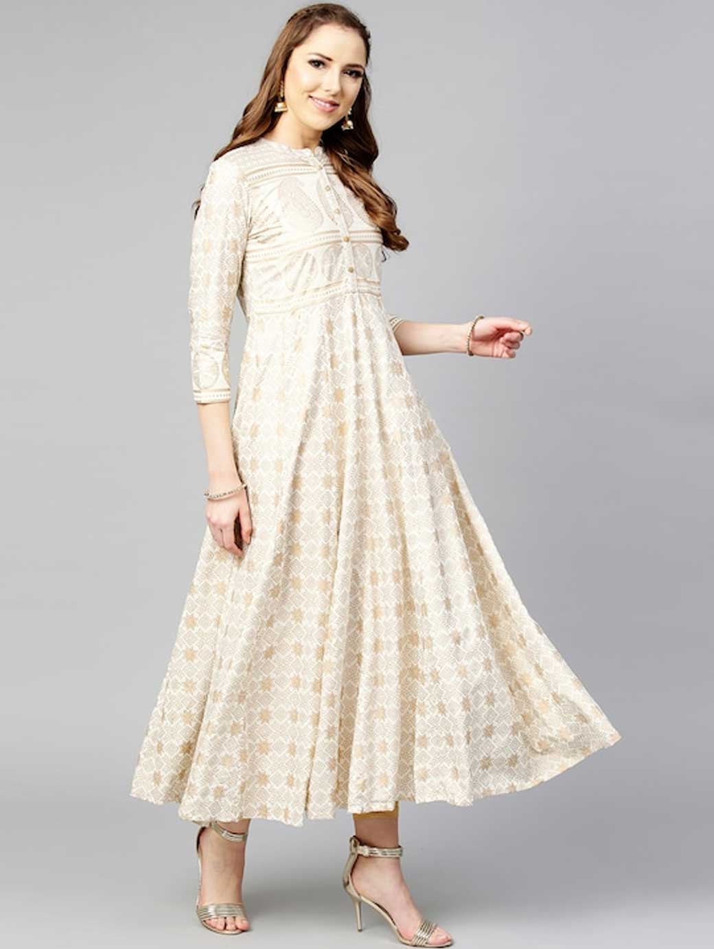 Green and teal blue floral printed anarkali kurta, has a round neck, three-quarter sleeves, and flared hem