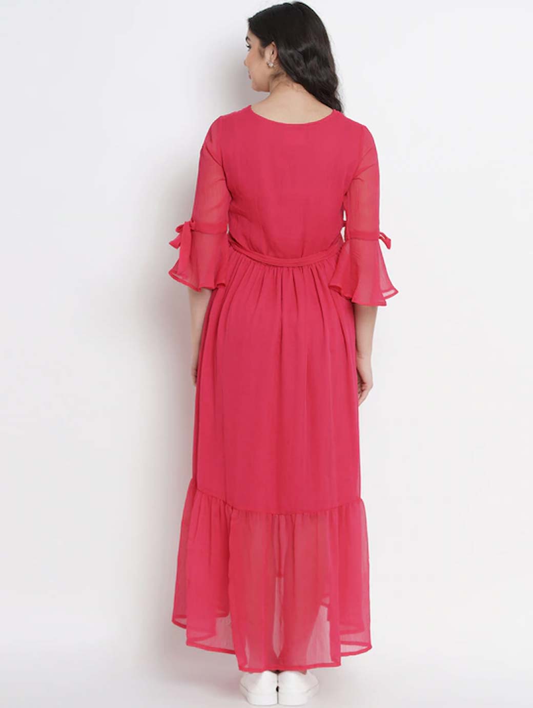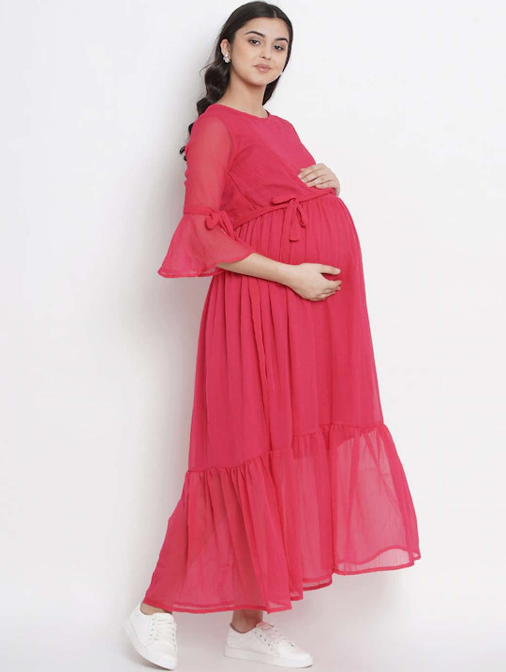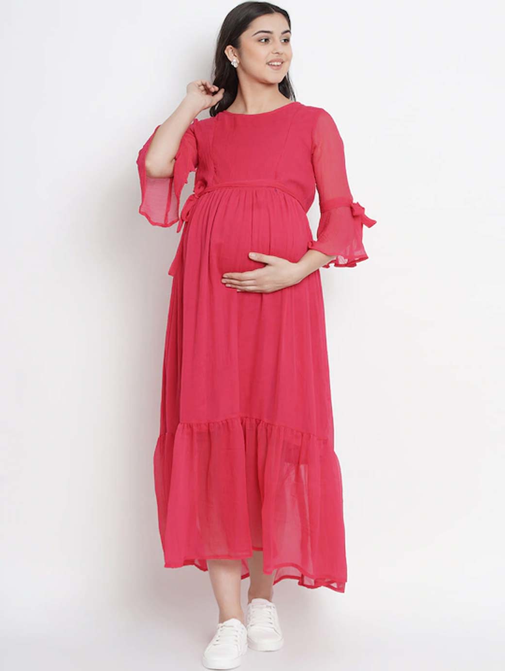 Pink solid woven maternity fit and flare dress, has a round neck, three-quarter sleeves, an attached lining, and flounce hem