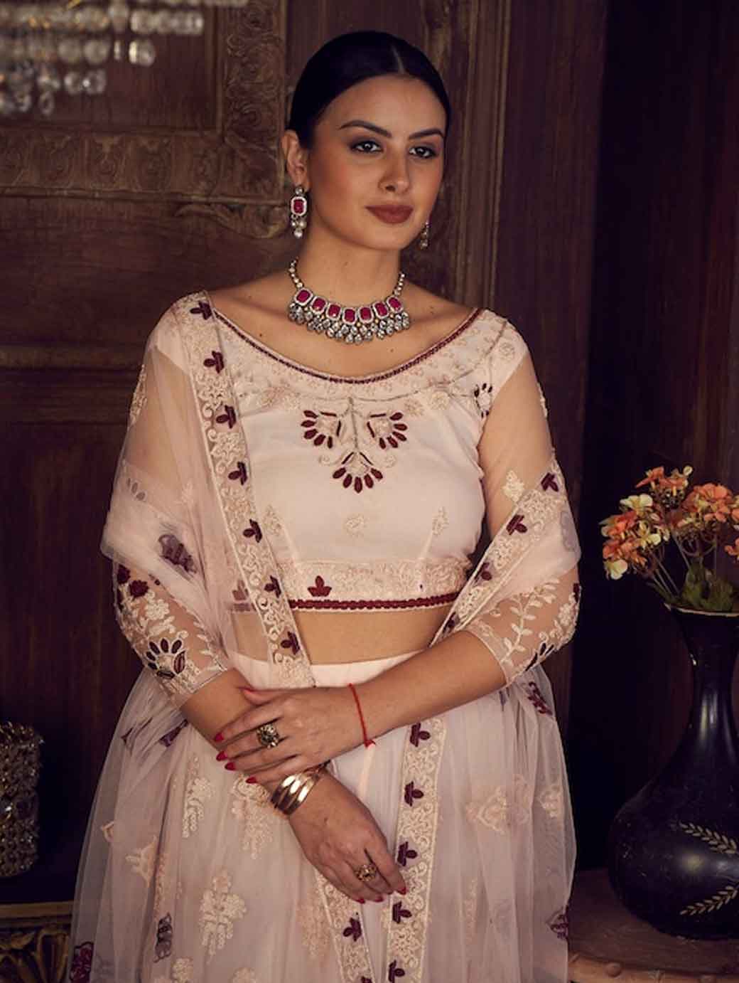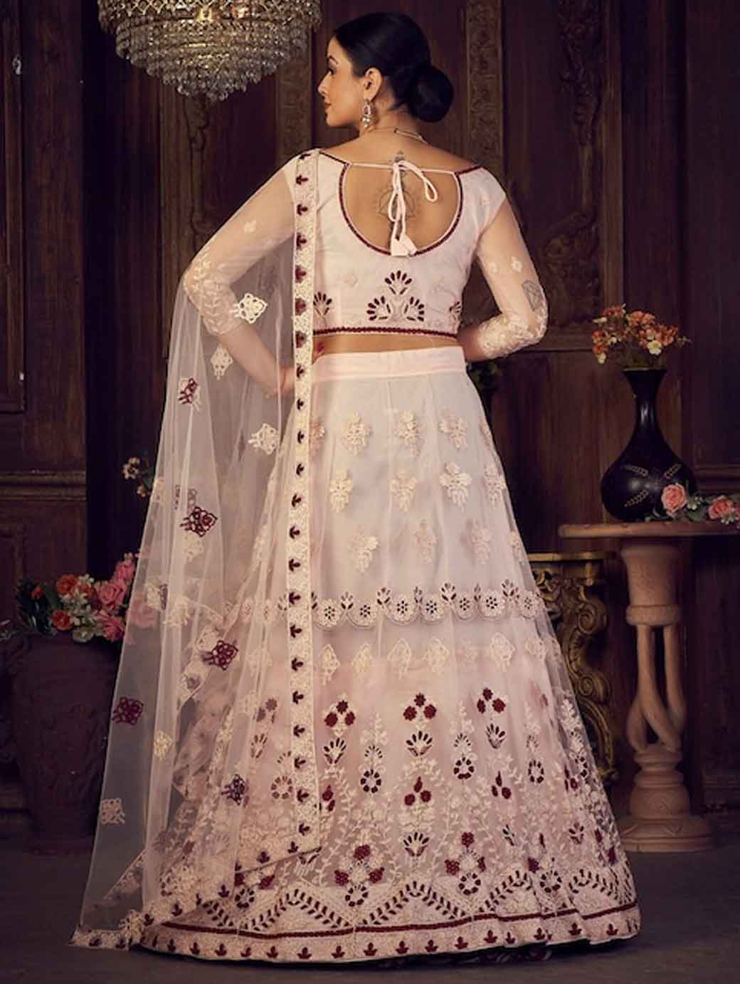 Pink and maroon embroidered lehenga choli with dupatta, thread work