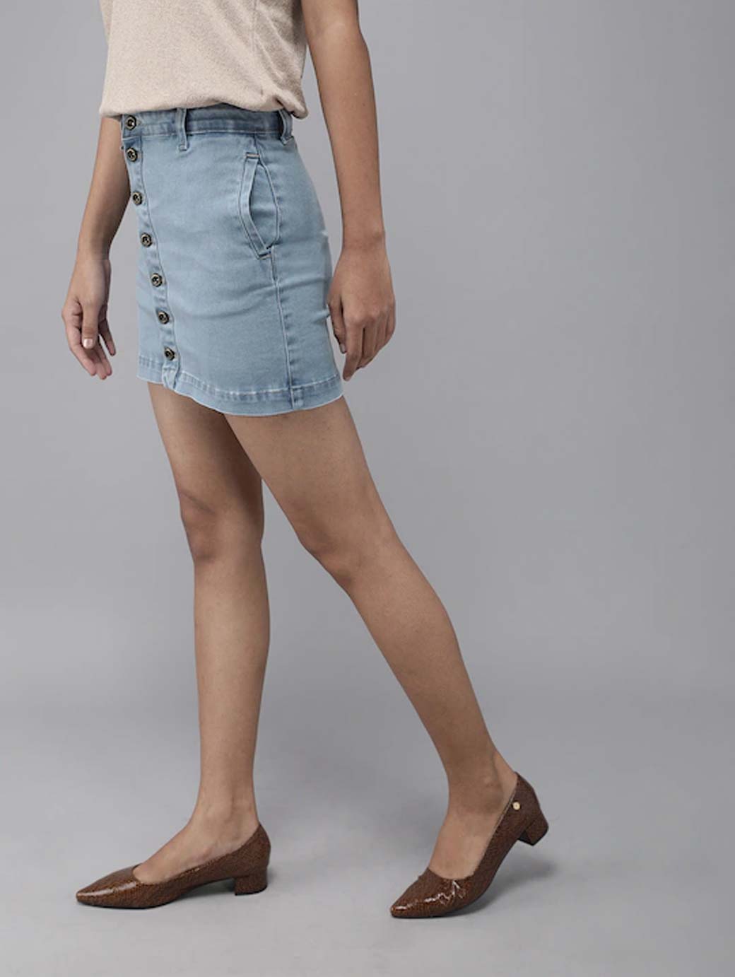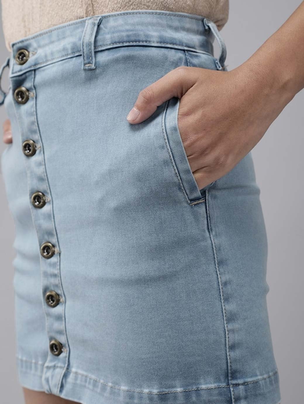 Blue solid woven denim skirt, has a waistband with belt loops, button closure, 2 pockets, straight hem