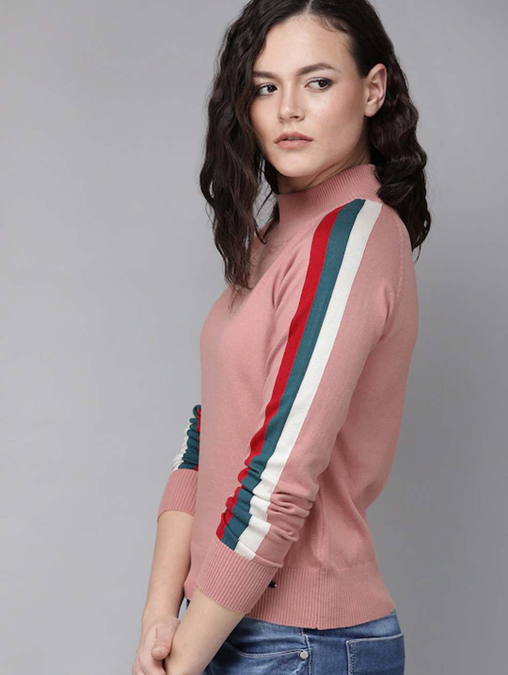 Pink solid knitted regular top, has a round neck, and long sleeves with striped detail
