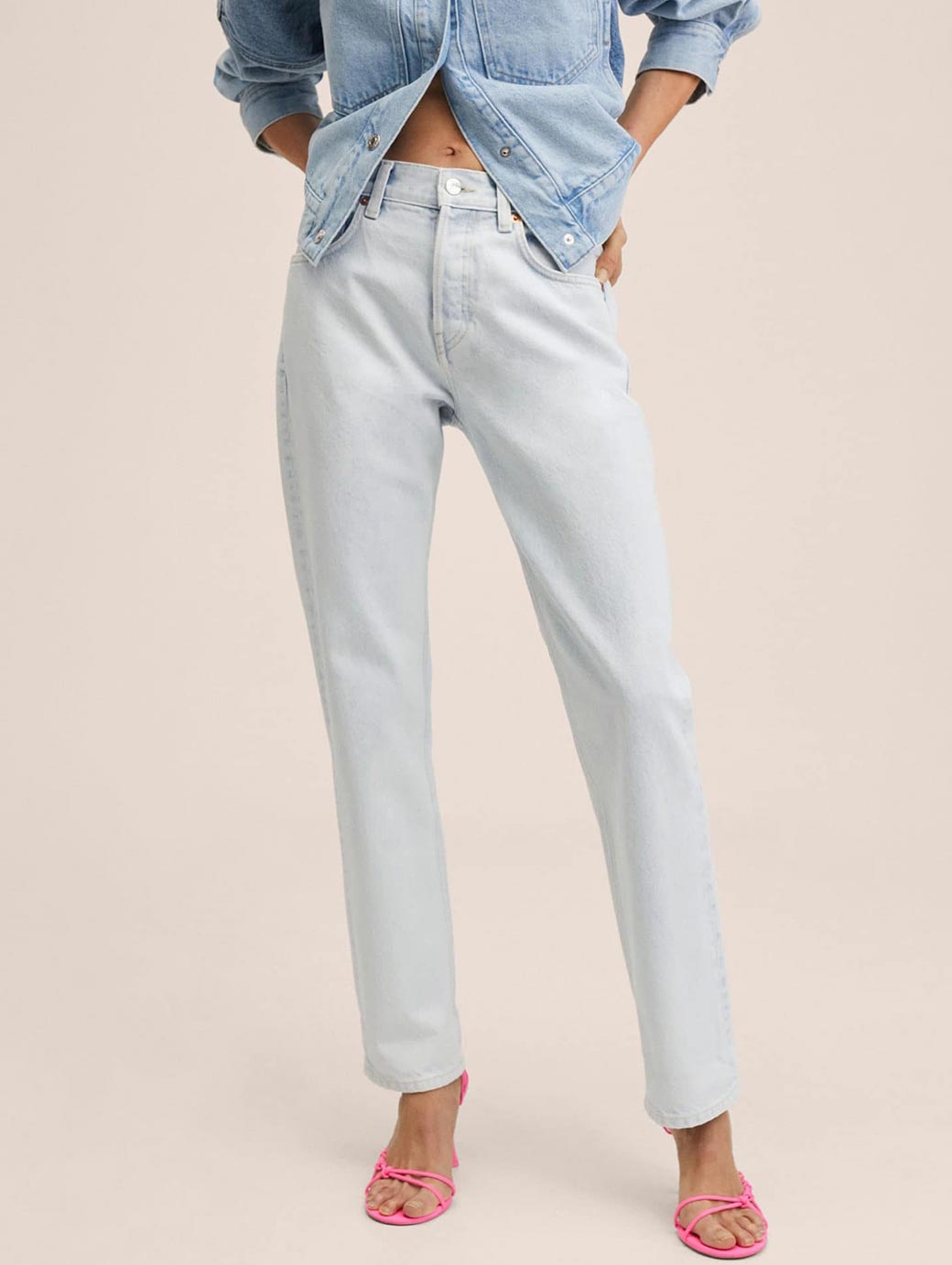 Light shade, no fade blue jeans Straight fit, mid-rise Clean look Non stretchable 5 pocket Length: regular