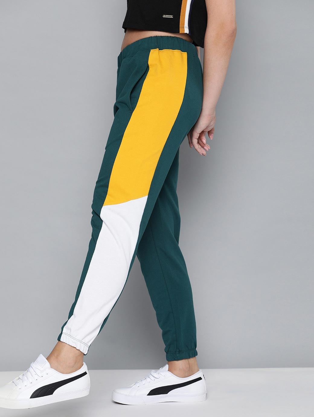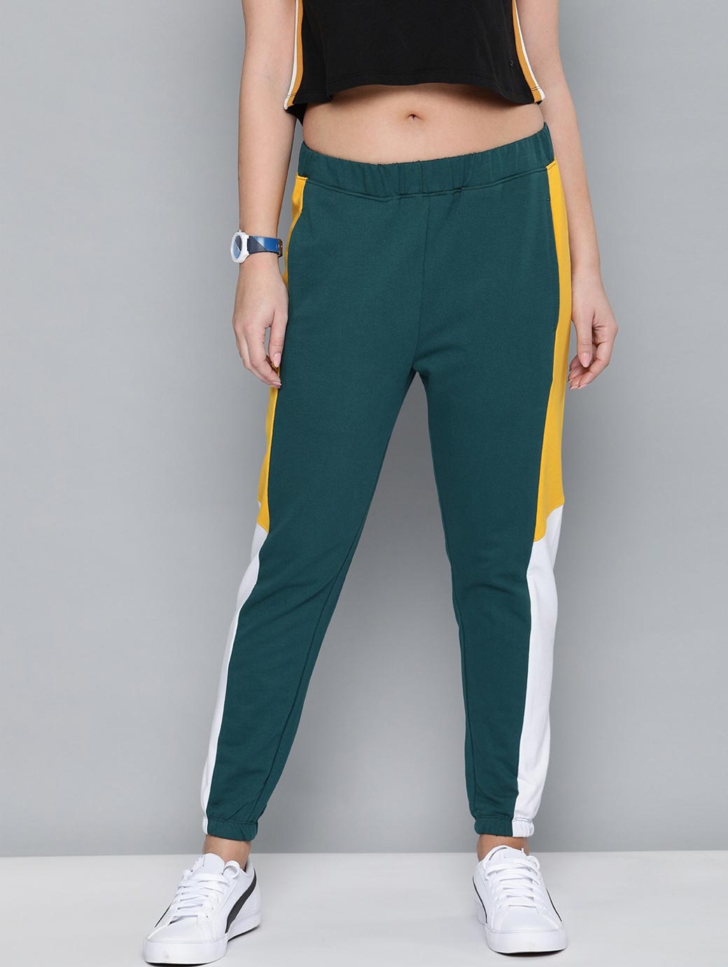 Green solid mid-rise cropped joggers with side panelling, has an elasticated waistband with drawstring closure