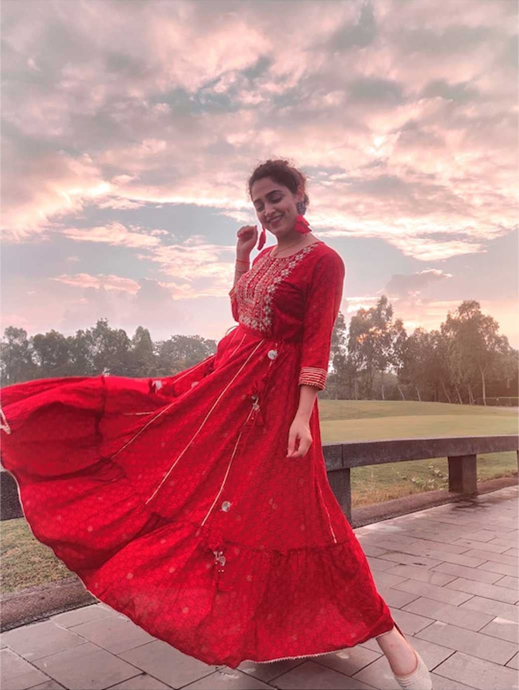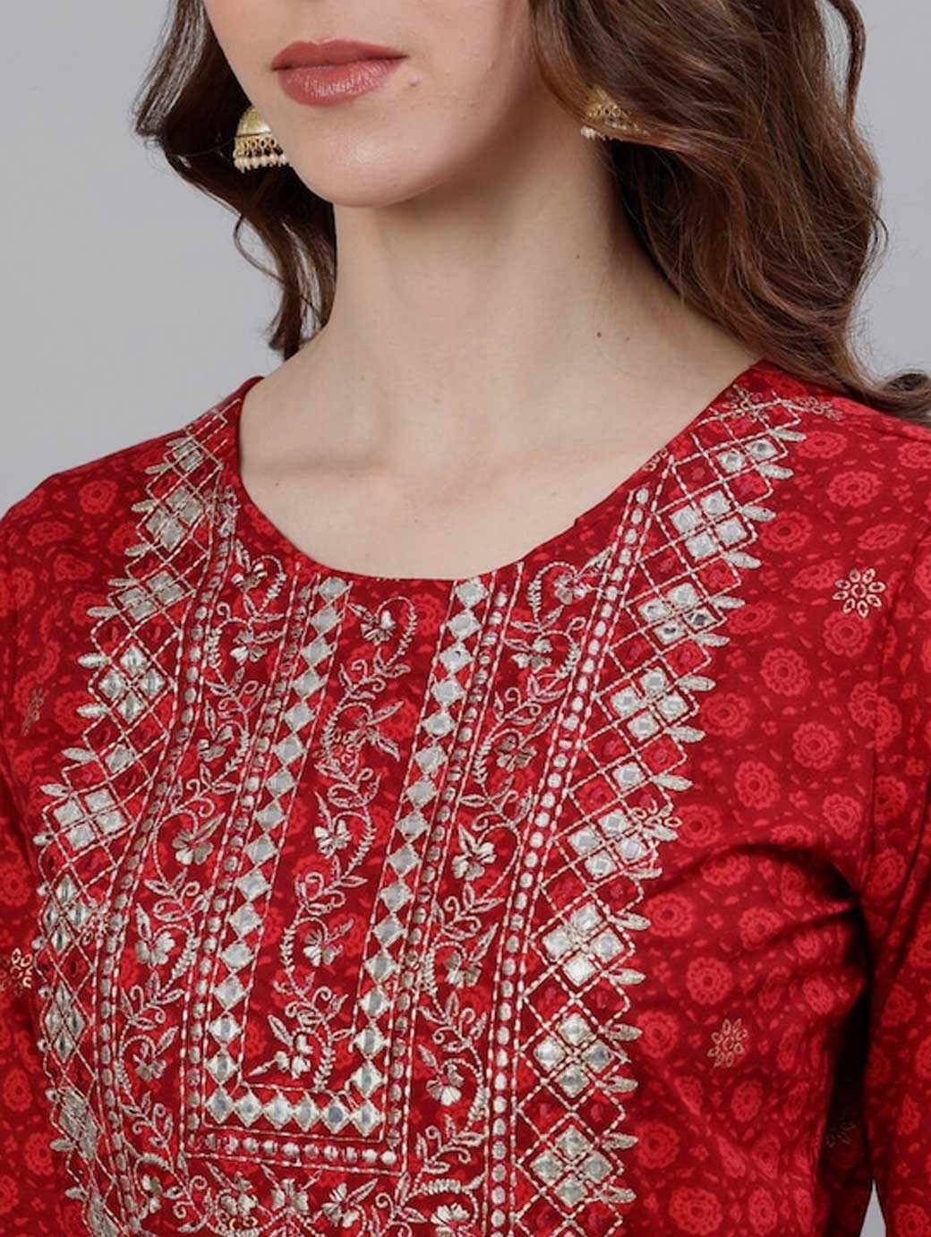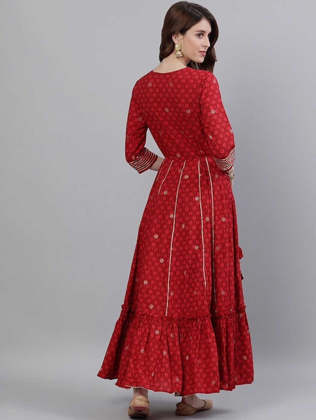 Abstract embroidered Round neck Short, regular sleeves Anarkali shape with empire style Zari detail Ankle length with flared hem Machine weave regular cotton